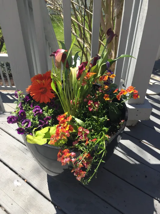 Watering is essential for container plants since they cannot draw water from the ground. You should water your container garden whenever the soil feels dry to the touch when you dig about 2 inches down in the pot. Fertilizing your plants once a month will help keep them healthy and promote growth or buy slow release fertilizer that can last up to 3-4 months. Deadheading is the process of removing dead flowers from your plants. This will encourage more blooms and help your plants look their best.